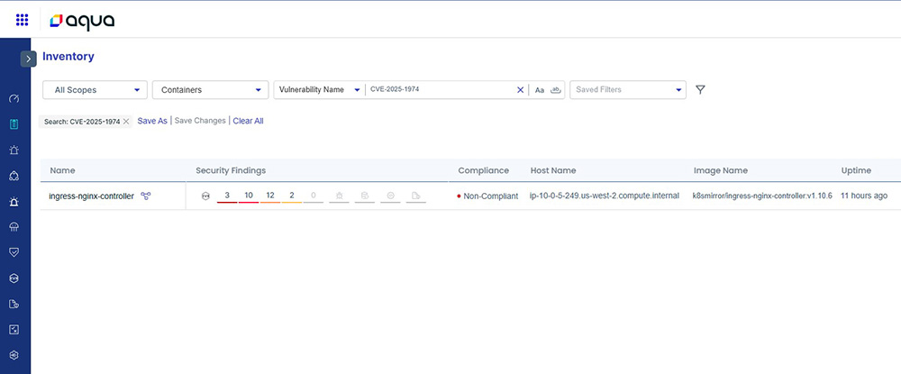 Figure 3: Aqua Hub search for this vulnerability in container/pods