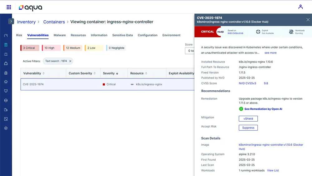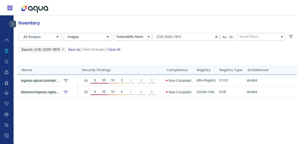 Use the Aqua Hub to detect any images or running containers/pods containing any of these vulnerabilities.
