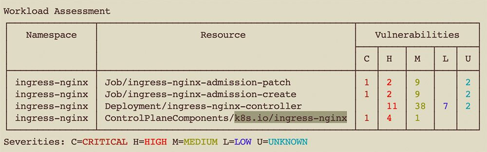 Aqua Trivy scans your cluster components directly (without going through the KBOM generation) – just like Trivy can scan your images for vulnerabilities. If you scan a vulnerable cluster, Trivy will flag the ingress-nginx component for you.
