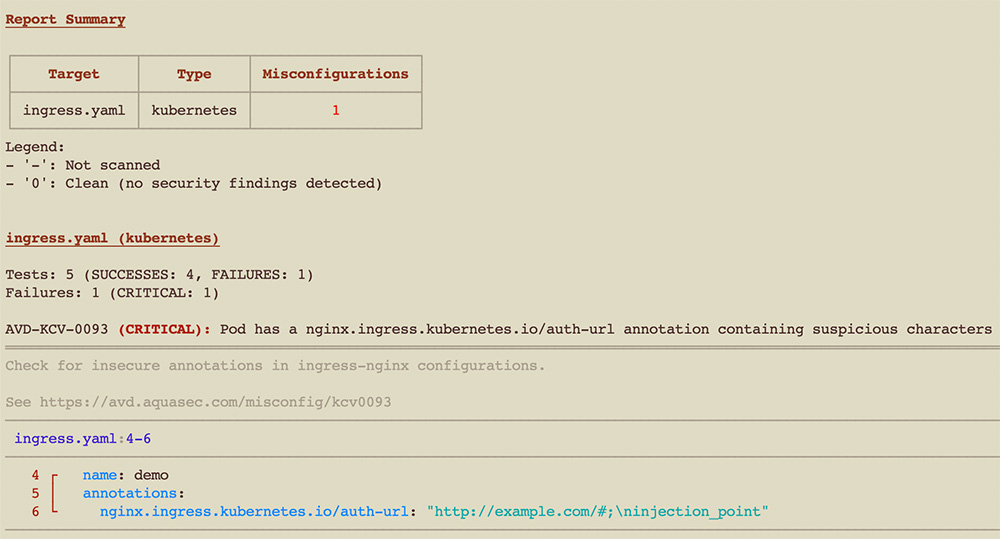 Trivy’s misconfiguration scanner identifies risk and bad security practices in IaC (Infrastructure as Code) files, including in Kubenetes Resource files. Scanning your Kubernetes Resources, including Ingress resources, will flag malformed resource annotations, which prevents the vulnerability from being exploited.